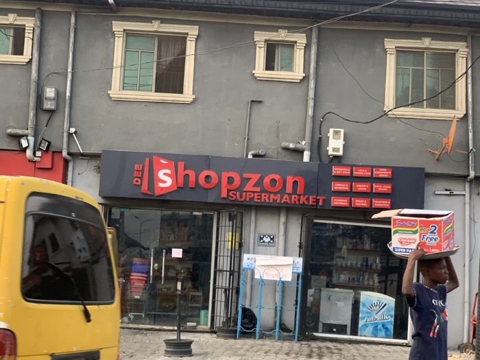 The image depicts an urban street scene in Lagos, Nigeria, featuring the facade of a commercial building