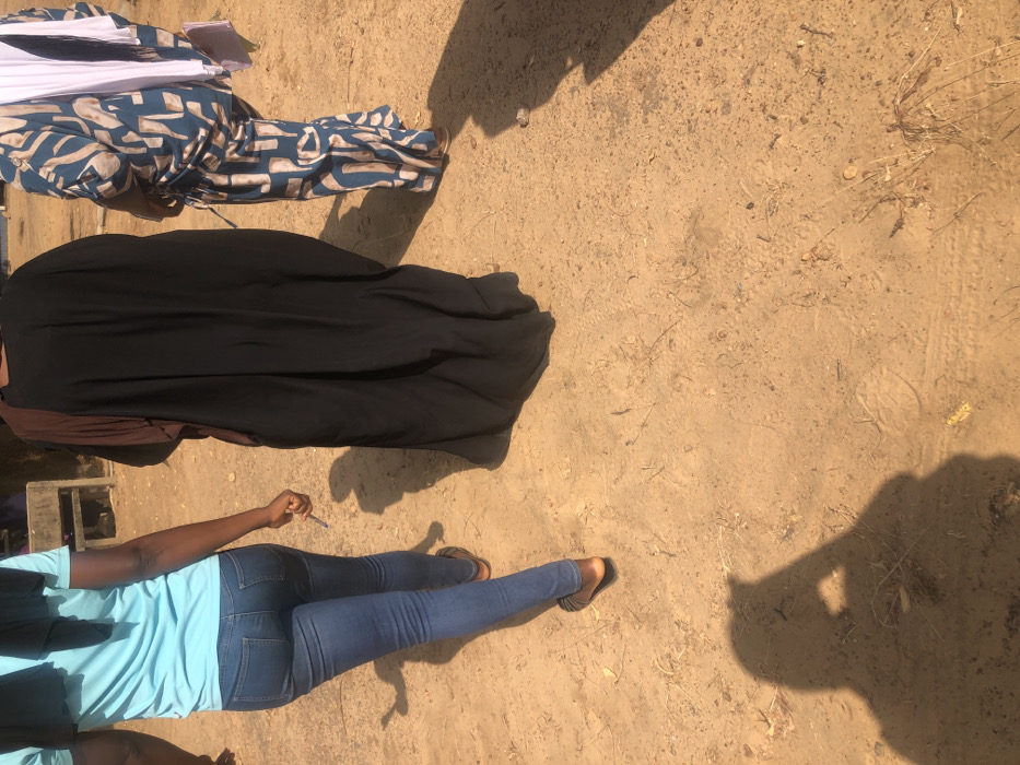 The scene depicts three individuals walking on an unpaved, reddish-brown earthen path under bright sunlight in Dutsinma B, Nigeria