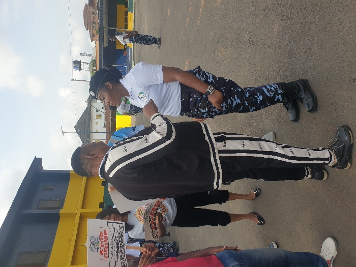 The scene depicts an outdoor gathering in Umuahia, Nigeria, on an asphalt surface. In the immediate foreground, a dark-skinned male subject, wearing a black tracksuit with white vertical stripes on the trousers and white banding on the sleeves, is engaged in conversation with a dark-skinned female police officer. The officer is dressed in a white short-sleeved polo shirt with a circular emblem on the left chest, blue and light-blue camouflage tactical trousers, black tactical boots, and a black patrol cap; a dark wristwatch is visible on her left wrist. To the left of this central interaction, a female subject holds a white sign with "STOP CRIME" visible in red text, partially obscured. Other individuals, some in similar police uniforms, are positioned in the middle and far background. The background features a two-story building with a dark blue upper section and a yellow lower section, along with another building exhibiting a dark, possibly tiled, roof. A utility pole and a water tank structure on a stand are also visible under an overcast sky. The assembly suggests a public awareness campaign or demonstration.