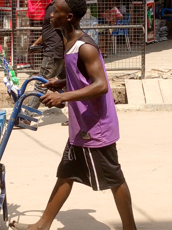 The image depicts a daytime scene in Fegge, Nigeria. In the foreground, a young male, appearing to be of Nigerian descent, walks right to left, pushing a blue metal trolley or cart. He wears a purple sleeveless top with white and black trim and black shorts with white vertical stripes on the sides. His skin appears shiny, consistent with perspiration. His right hand is visible on the trolley's handle. The trolley's front section holds various items, including plastic bottles or containers wrapped in green and white material. Behind the main subject, a second individual is partially visible from the waist down, wearing a black shirt, dark jeans, and holding a dark rectangular object. The ground is a light-colored, uneven surface, possibly a combination of dirt and concrete, with a rectangular open drainage channel visible in the middle ground. In the background, a metal grid fence separates the foreground from a commercial area. Behind the fence, various objects are visible, including what appears to be red plastic bags, blue chairs, and a white sign with red lettering.