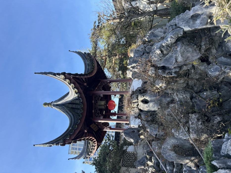 A Chinese garden pavilion with curved rooflines sits alongside a rock formation