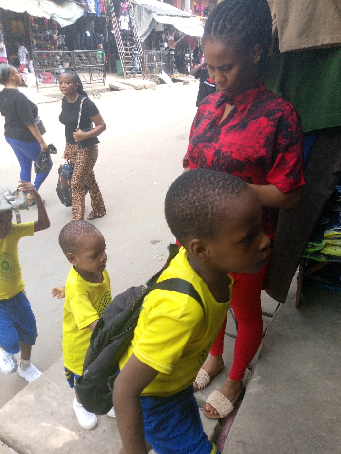 The image depicts a bustling street scene in a market area of Onitsha, Nigeria. In the foreground, an adult woman with braided hair wears a red and black patterned collared shirt, red leggings, and light brown woven slide sandals. Her gaze is directed downwards. Partially obscuring her is a young boy with short dark hair, wearing a yellow short-sleeved shirt with a black backpack and blue shorts, looking towards the right. To the left of this boy, a younger boy with short dark hair wears a yellow short-sleeved shirt featuring a green logo and blue shorts, walking in white sneakers and looking towards the left. Further to the left, a third young boy, also in a yellow shirt and blue shorts with white sneakers, is partially visible, holding a light-colored object above his head. In the mid-ground, two women walk away from the camera. One wears a black short-sleeved top, leopard print pants, and dark open-toed sandals, carrying a black shoulder bag and a black shopping bag. The second woman wears a black short-sleeved top and blue leggings, carrying a black bag. The background reveals a vibrant market environment with multiple stalls under awnings and corrugated metal roofs, displaying various clothing items and other merchandise. A metal ladder is visible, ascending to an upper level of a background structure. The ground is a light-colored paved surface.