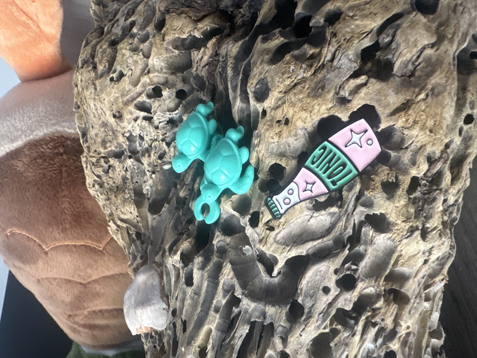 This image depicts a static close-up arrangement in Budva, Montenegro. Three distinct decorative objects rest on a piece of weathered, textured driftwood. Two small, teal-colored plastic figurines, each resembling a sea turtle, are centrally positioned. The lower turtle features a front clasp-like appendage. Below and to the left of the turtles, a light pink enamel pin shaped like a bottle is present, featuring the word "TONIC" in green lettering with white accents and star motifs. The driftwood, characterized by numerous holes and grooves, displays a brownish-grey coloration. In the upper-left background, a small, irregular light-colored object, possibly a shell or stone, is partially visible on the driftwood. The main background consists of a large, soft, out-of-focus object exhibiting brown and off-white fabric textures. No individuals, actions, or interactions are visible.