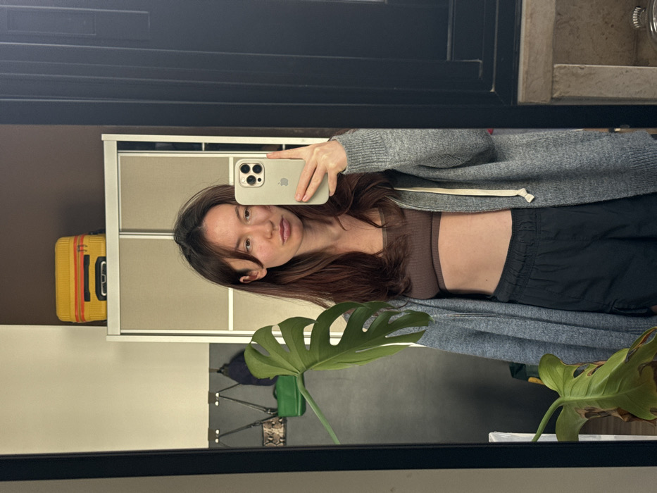 A woman is depicted taking a mirror selfie in an indoor residential setting in Tel Aviv-Yafo, Israel. The subject, a female with long, straight, dark brown hair and a neutral, slightly pouting expression, is positioned centrally in the frame. She wears a brown bralette, black loose-fitting pants, and an unzipped grey hooded cardigan with light drawstrings. Her right hand holds a light-colored smartphone (an iPhone model with three prominent camera lenses), which is pointed towards the mirror to capture her reflection. A large, green, fenestrated Monstera plant leaf is prominently visible on the left side of the reflection, partially obscuring the woman's left arm and side, with a smaller, partially browned leaf visible below. In the background, a white cabinet with light-colored doors is visible, topped by a yellow rectangular box with orange stripes and black details. To the left of the cabinet, a dark grey wall section features three hooks, from which hang a snakeskin-patterned purse, a green shoulder bag, and a dark bag. The room's walls are light beige and darker brown, with a dark vertical architectural element visible on the right, above a light-colored countertop with a clear glass object.