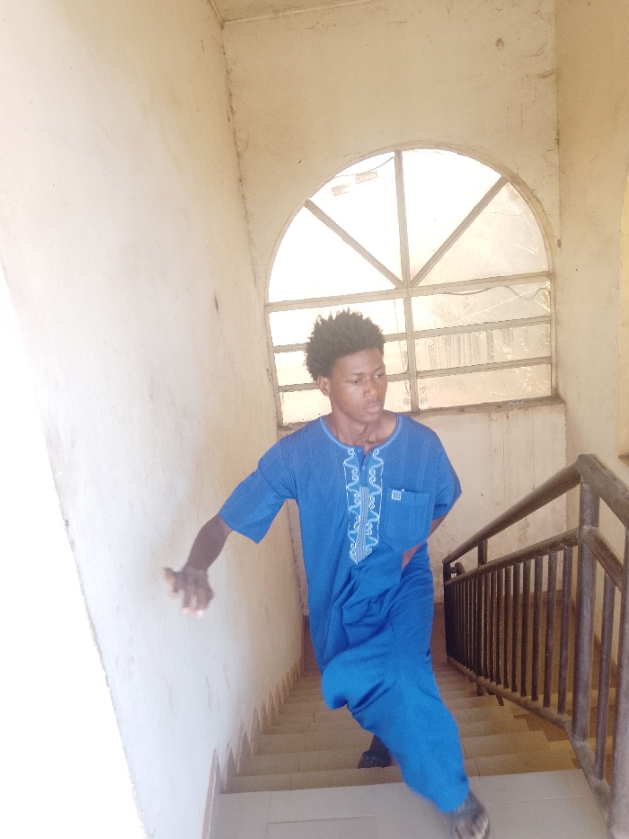 A single male individual is captured mid-descent on an indoor staircase in Sabon Tasha, Nigeria