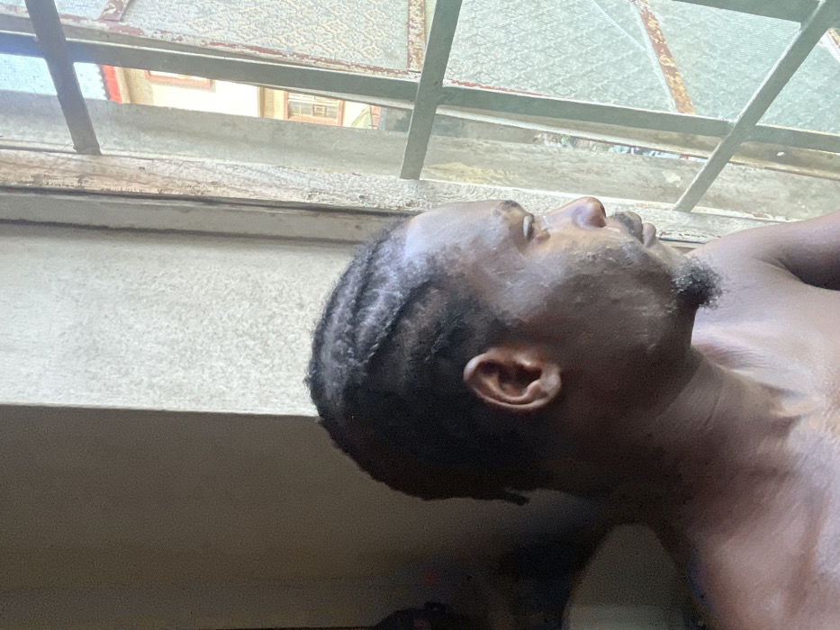 A shirtless man lies with his head near a windowsill, gazing upward. The window features a grid pattern with peeling paint and a distant view of a building with red and yellow elements. The man's head is turned to the side, showcasing a trimmed beard, a prominent nose, and an ear. Braided hair frames his head. The room is dimly lit, emphasizing the man's skin tone and the textures of the window and surrounding wall.
