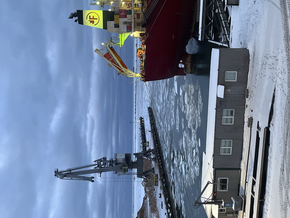 A large red ship with a funnel bearing the letter "F" is docked beside a pier. The water between the ship and pier is full of ice floes. A gray crane stands on the pier. A small, gray building with windows sits to the right. Snow covers the ground and the building's roof. The sky is overcast with dark clouds.