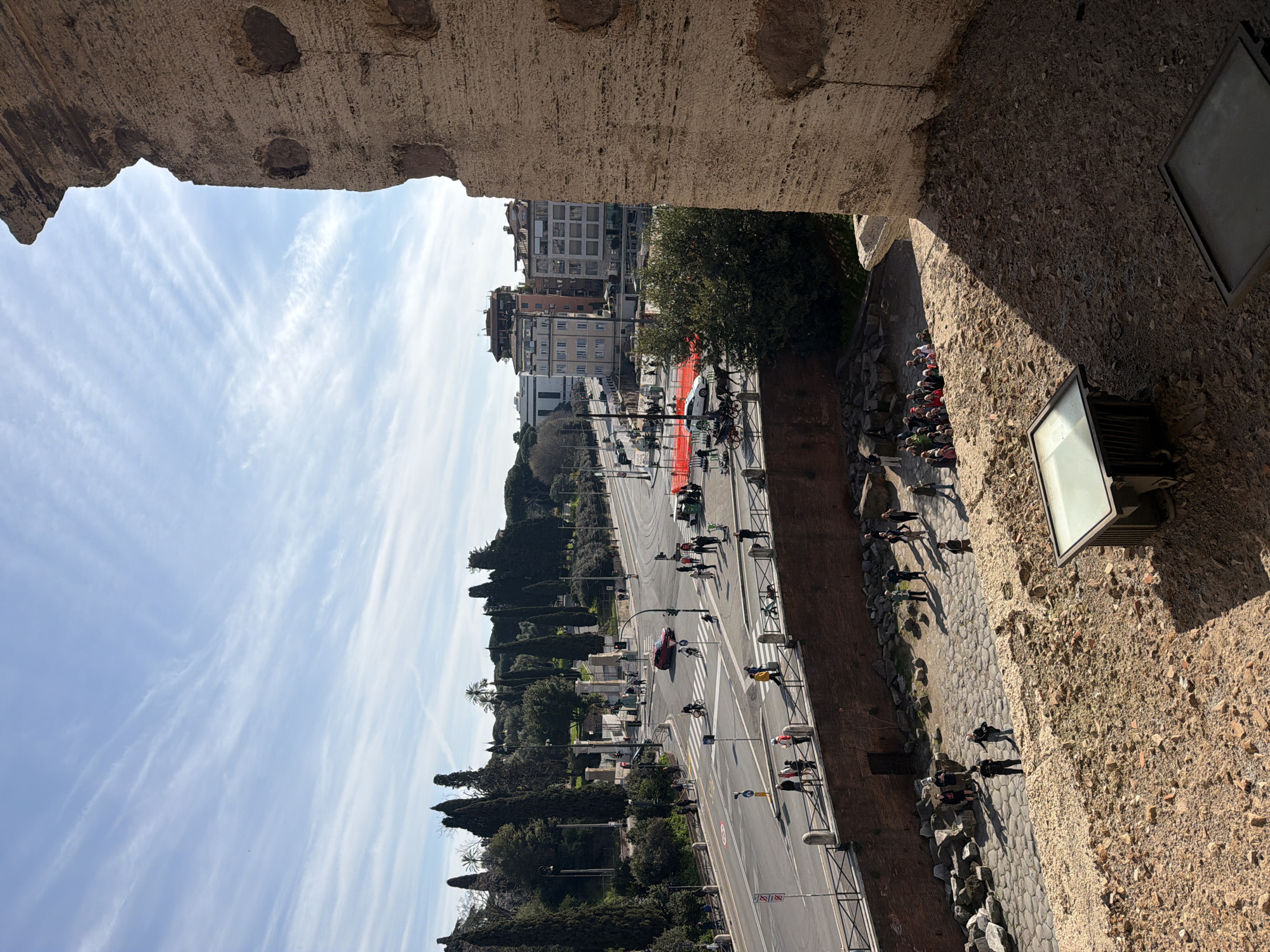 From an elevated perspective within a weathered, ancient structure, a street scene in Rome, Italy unfolds. A main thoroughfare, lined with mature trees and sidewalks, stretches into the distance towards buildings. Pedestrians are strolling along the sidewalks. Vehicles, including cars, travel along the road. The scene is illuminated by natural light. The sky is partly cloudy. A stone wall and a light fixture are in the foreground.