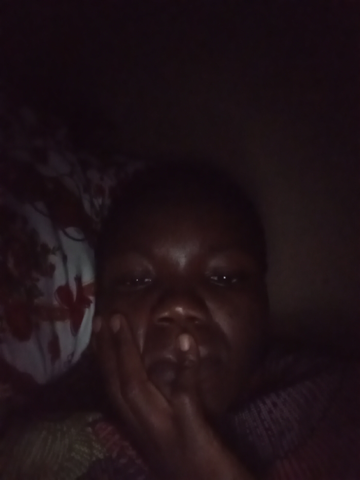 A dimly lit close-up of a person with dark skin. The individual rests their face on their hand, with fingers partially covering their mouth. The eyes are open and gaze forward. To the left, a pillow with a floral pattern is visible. The person seems to be wearing a multicolored, patterned top. The lighting is poor, creating shadows and limiting the details that can be observed.