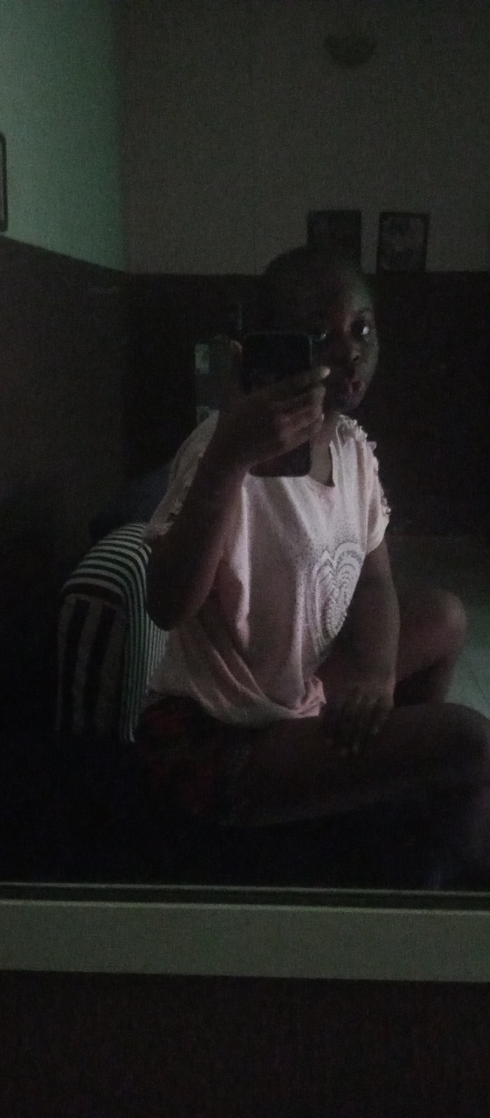 A young woman sits cross-legged on a dark surface, likely a bed or couch. She is taking a selfie in a dimly lit room, her face partially obscured by her phone. She wears a light pink t-shirt and red shorts. A striped cushion is visible behind her. The room appears to have dark-colored walls with some framed pictures. The image is a reflection captured in a mirror.