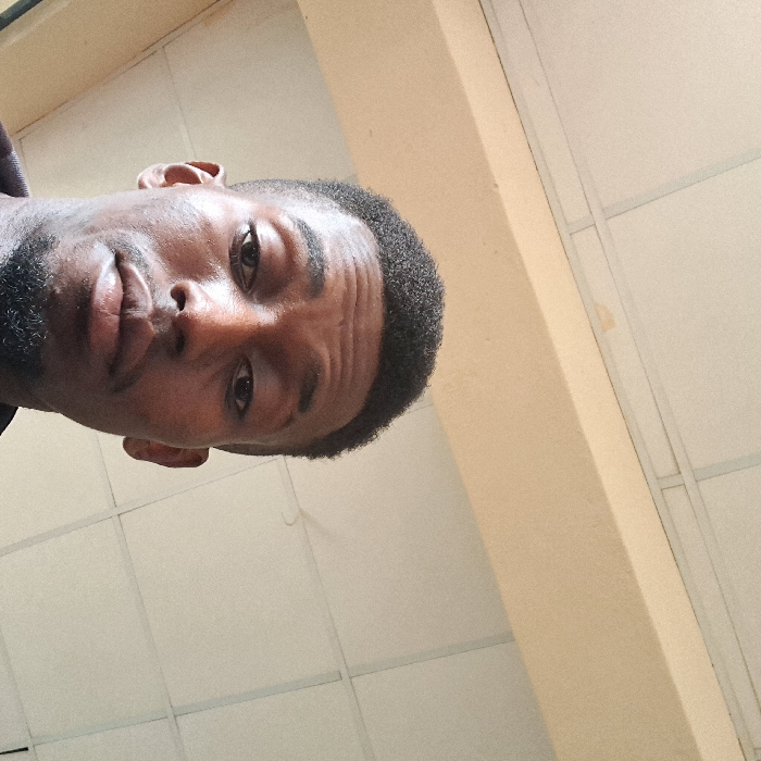 The image displays a young adult Black male positioned centrally, facing directly towards the camera. He has short, dark, textured hair and a neatly trimmed beard and mustache. His expression is neutral. A dark garment is visible around his neck. The background consists of an indoor architectural environment. A light-colored structural beam traverses horizontally across the upper portion of the frame. Above this beam, a white ceiling with a visible grid pattern of square tiles is present, featuring a minor, irregular discolored area on one tile in the upper left quadrant. The precise location within the city of Ihiagwa, Nigeria, cannot be determined from the visual information provided.