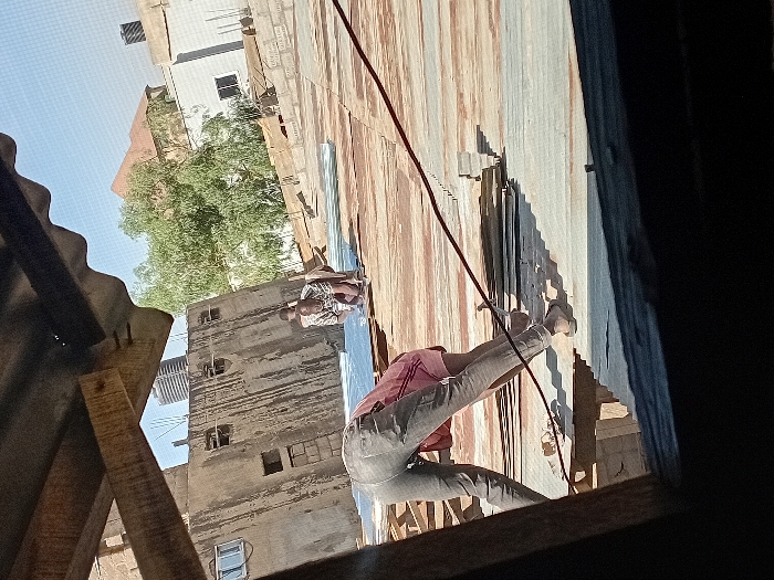 The image depicts an outdoor scene in Gandu Albasa, Nigeria, viewed from a slightly elevated perspective, possibly from within an adjacent structure, with a corrugated metal overhang and wooden beams framing the top and left of the view. The scene is illuminated by daylight under a clear blue sky. Three individuals are present on a weathered, rusty corrugated metal roof. In the immediate mid-foreground, a person wearing grey trousers and a red shirt is bent forward at the waist, appearing to be working on the roof surface. Their feet are in open-toed sandals. Further back and to the right, another individual, wearing a patterned long-sleeved shirt, is crouched on the roof, actively engaged with light-colored, possibly new, corrugated metal sheets that are laid out and stacked. A third person is partially visible behind and to the right of the crouching individual. A dark, thin cable runs diagonally across the midground. The background features various buildings and vegetation. To the left, a multi-story building with a weathered, light-colored concrete or stucco facade contains several small, rectangular window openings. Behind this building and further left, a modern, darker high-rise structure is visible. In the center-right background, a building with a prominent red-brown pitched roof is largely obscured by a large green tree. To the far right, a white building with a flat roof and a dark water tank on top is visible.