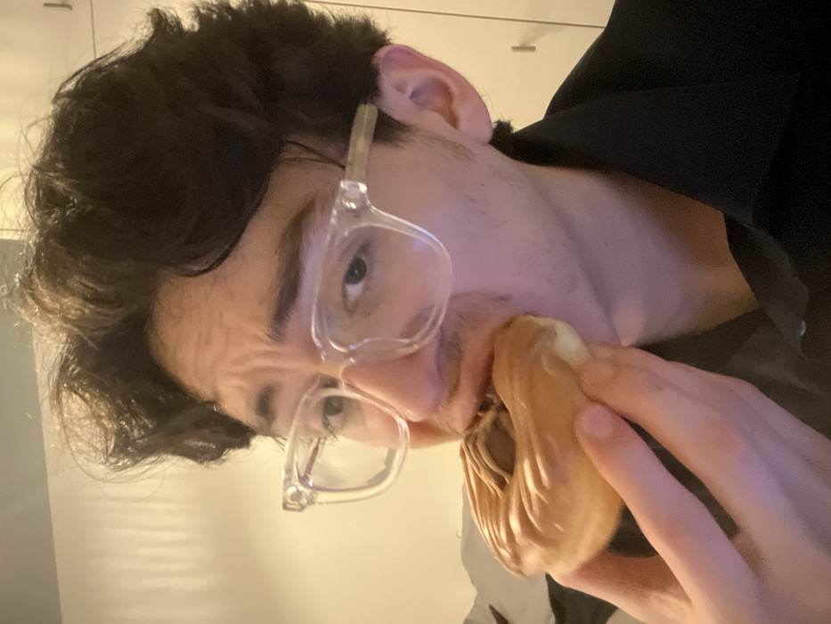 - "A man with dark, curly hair and clear glasses is holding a chocolate-filled pastry to his mouth, seemingly about to take a bite" by FM-NQrs03, licensed under CC BY 4.0