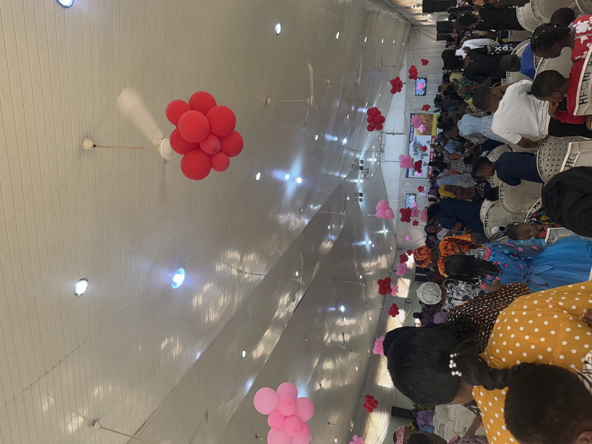 n indoor event, likely in a hall or large room in Barnawa, Nigeria, indicated by the presence of a sign visible in the background. Numerous people, including women and children, are seated on white plastic chairs. Red and pink balloons are scattered throughout the room, suspended from the ceiling. The ceiling is white and features multiple recessed lights and ceiling fans. Many people are looking down.