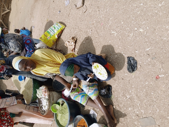 An outdoor market scene in Communauté rurale de Payar, Senegal, depicts a woman and a child seated on the dusty ground in the foreground. The adult female, wearing a yellow headscarf over a light blue under-scarf and a patterned dress, sits with her bare legs extended, holding papers or money in her hands. She looks directly towards the viewer. Beside her, a young child, dressed in a dark blue hooded garment over a green under-scarf and orange trousers, sits cross-legged, holding a white plate containing a light-colored meal with green components, which they are eating with a white spoon. Around the woman, various market goods are displayed on the ground and in containers. To her left, a large, dark green bowl is filled with a pale granular substance, likely rice. Adjacent to it, a smaller, dark bowl contains a green powdered substance, with a light green scoop resting inside. Above these, a round, woven tray holds numerous small, white, rounded objects, possibly soap or food items. Another bowl, partially visible, contains reddish-orange granules. The ground is light brown, dry, and scattered with small debris, including a crumpled black plastic bag near the woman's feet, another further out, and a red bottle cap. In the background, other individuals are visible, including a person in a patterned top behind the woman, and a small child in a blue outfit seated further back. A yellow and green plastic bag lies on the ground to the right of the primary subjects.