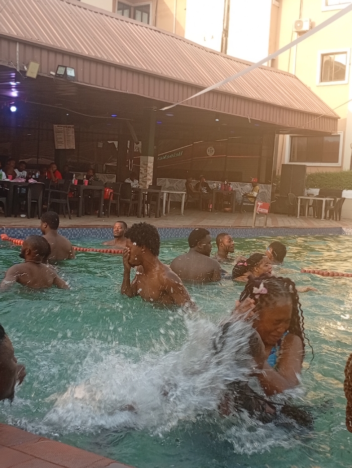 People are swimming in a pool with a rope separating the shallow end from the deeper end. A covered patio area with tables and chairs is visible behind the pool, with individuals seated and standing underneath. The pool water splashes around the people, particularly near a woman with braids in the foreground. The overall atmosphere suggests a recreational setting.