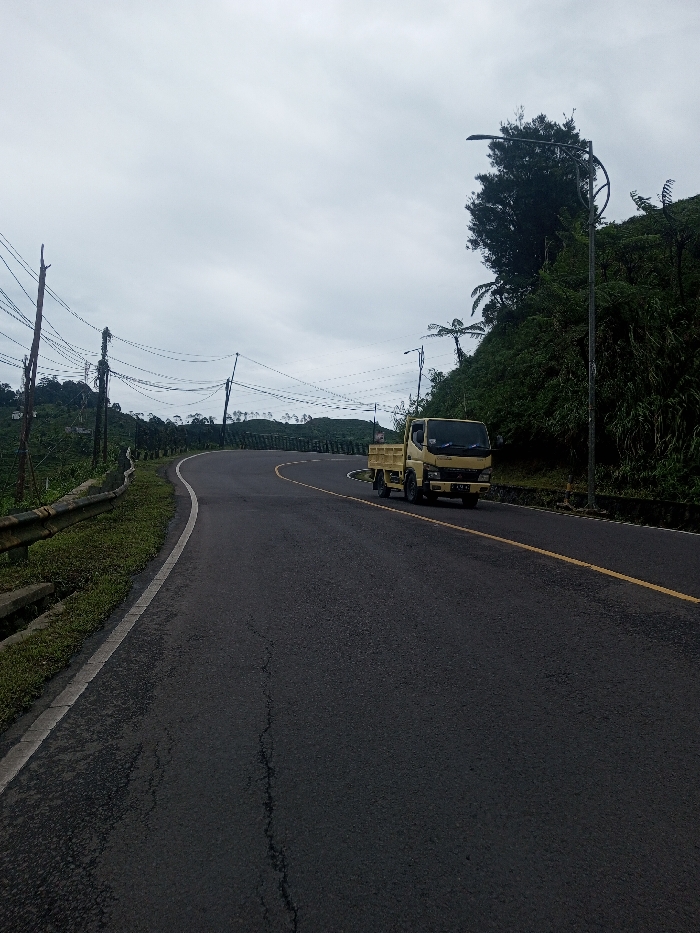 The image depicts a winding asphalt road in a hilly, vegetated area of Ariyalai, Sri Lanka, under an overcast sky. The road features a solid yellow center line indicating two-way traffic and a white line marking the shoulder on the left side. Minor surface cracking is visible on the asphalt. A light-yellow (or beige) small flatbed truck is observed on the right side of the road, moving away from the viewer and negotiating a left-hand curve. The truck has a black front bumper and dark wheels. No driver or passengers are discernible. To the left of the road, a metal guardrail follows the curve, with dense green vegetation and several wooden utility poles carrying multiple overhead wires situated beyond it. The landscape on both sides of the road consists of steep, verdant slopes covered with various trees and lush foliage, including some taller trees and palm-like structures. Two black streetlights with modern LED fixtures are positioned on the right side of the road, integrated into the green embankment. The sky is uniformly light gray and cloudy. No individuals are visible in the scene.