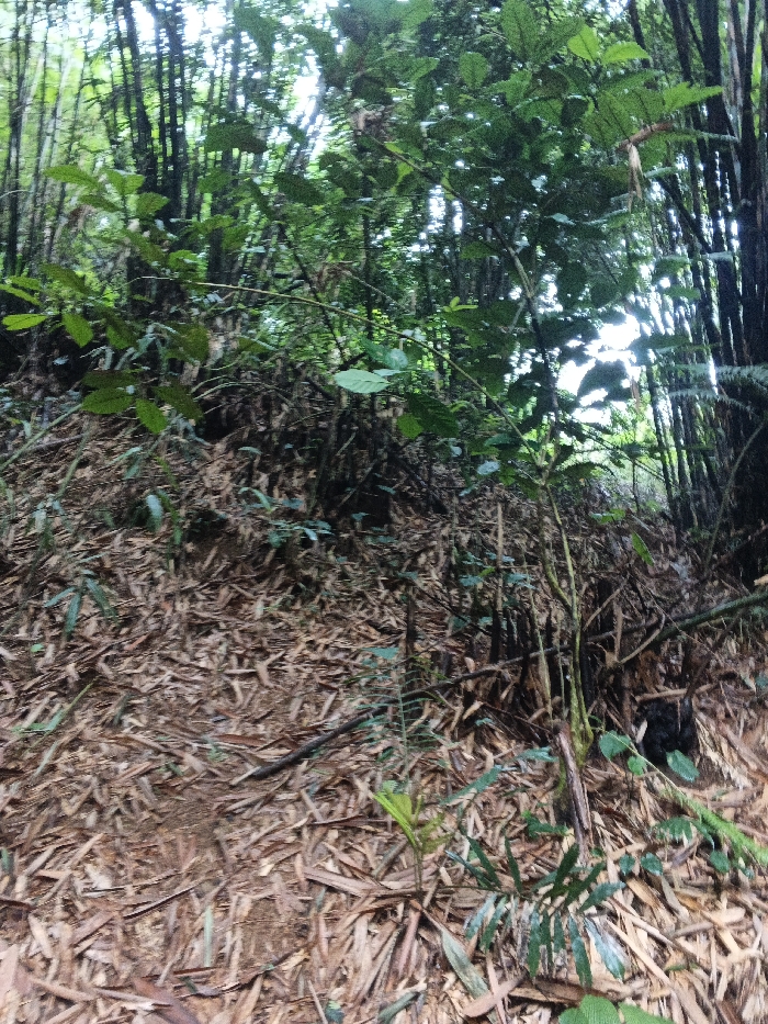 The image depicts a natural environment within Situm, Papua New Guinea, specifically a dense forested area. The ground surface is predominantly covered with a thick layer of dried, light brown leaves, indicative of fallen bamboo foliage, with patches of exposed dark earth. A narrow, unpaved path or trail is visible traversing the lower and middle sections of the frame, ascending slightly from the lower left to the center-right. Dense green vegetation, including small shrubs, young trees, and various leafy plants, occupies the foreground and midground, with some undergrowth partially obscuring the path. In the background, numerous tall, slender tree trunks, consistent with bamboo, rise vertically, forming a dense canopy. The upper portion of the frame shows a mix of dark green foliage and glimpses of bright, overcast sky through gaps in the tree canopy, suggesting natural daylight. No people, animals, or man-made objects are present in the scene.