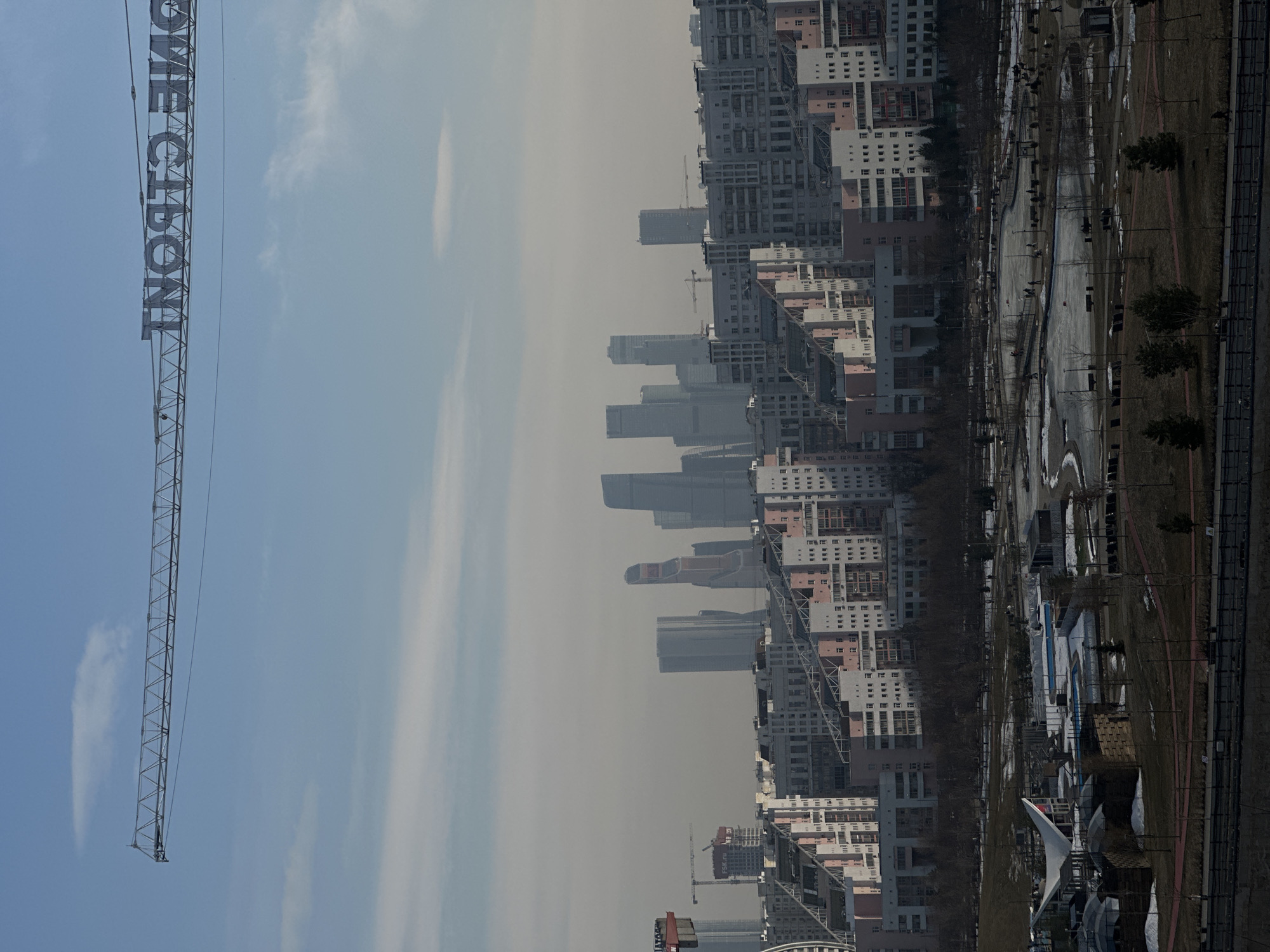 The image displays an urban landscape in Khimki, Russia, under a clear blue sky with minimal atmospheric haze. A large metallic construction crane boom spans the upper portion of the frame, bearing the mirrored Russian text "ФСК СТРОИТ" (FSK BUILDS) horizontally. In the far background, a cluster of tall, modern skyscrapers, consistent with the Moscow International Business Center, are visible. The mid-ground features a dense array of multi-story residential buildings, characterized by a mix of grey, white, and pale pink facades. Several additional construction cranes are present among these buildings, indicating ongoing development; one tower crane on the left has "FSK.ru" visible on its structure. The foreground shows a large park area. The ground is largely brown and sparsely vegetated, with visible patches of snow and ice, particularly on what appear to be frozen water bodies. A red-colored path meanders through the park. Numerous bare deciduous trees and some small evergreen trees are distributed throughout the area. Park infrastructure includes a distinctive white, angular building with a red accent, and other smaller structures. Several individuals are discernible walking on the paths and near the frozen areas within the park. A dark barrier or fence runs along the bottom edge of the image. No specific interactions or detailed features of individuals are resolvable due to the distance.