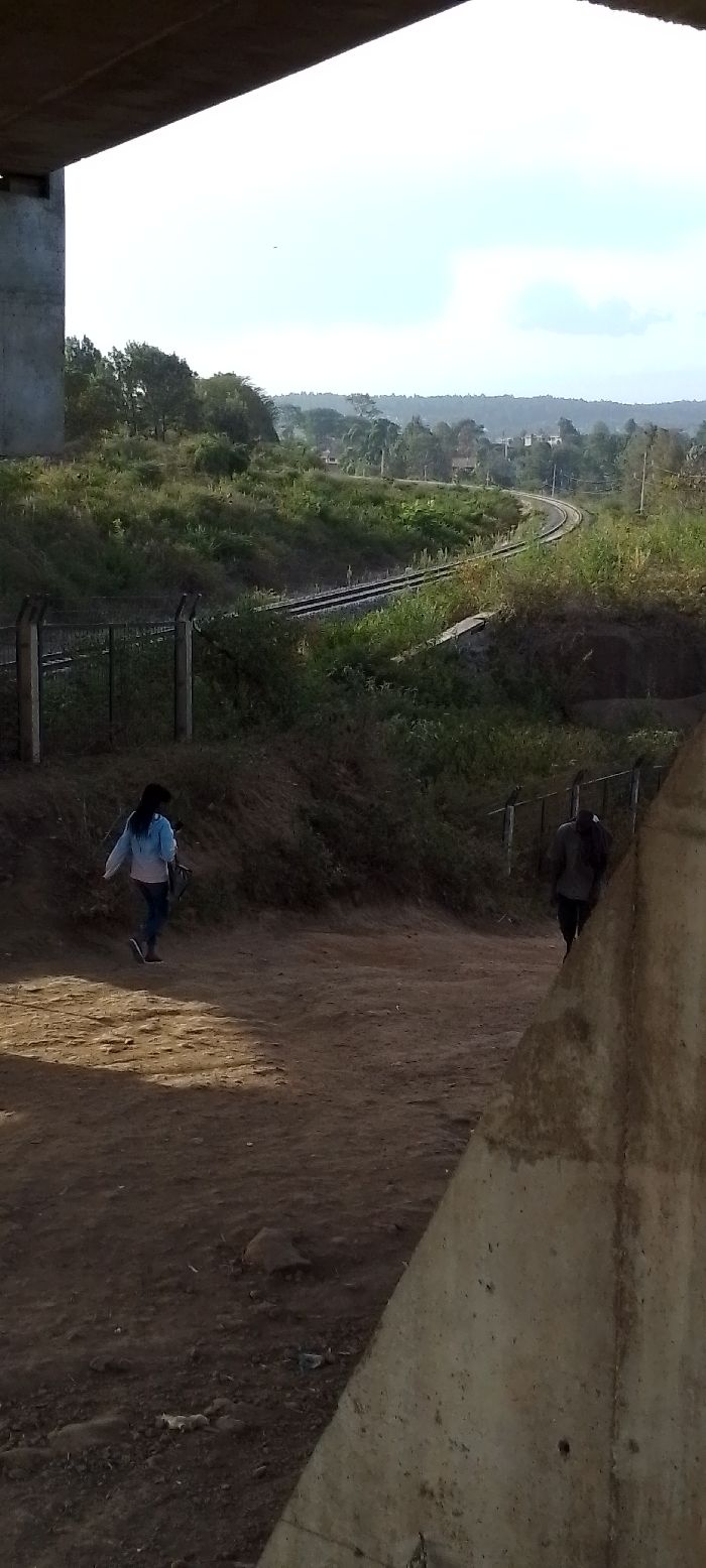 - "Under a concrete bridge, a dirt path leads uphill past a fence and train tracks" by FM-IqF5p1, licensed under CC BY 4.0