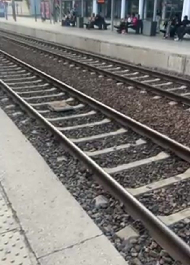 view of a train station platform and tracks from a low angle. The platform edge is visible on the left, with grey textured paving. Two sets of parallel train tracks run across the center of the frame, with gravel between the ties. On the opposite platform, there are benches and trash cans, and several people are sitting or standing, seemingly waiting. A silver high-speed train approaches along the tracks from the distance and rushes past.
