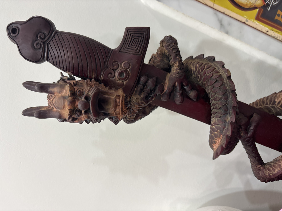 This image depicts a close-up, vertical shot of a dark reddish-brown carved wooden ornament, situated within a premise in the city of Varna, Bulgaria. The central subject is a stylized dragon intricately carved around and gripping a sword-like object. The dragon features a prominent head positioned towards the upper center, characterized by an open mouth revealing carved teeth and an interior cavity. Its snout is distinct, and two short, rounded horn-like protuberances extend upwards from the back of its head. The dragon's body, detailed with carved scales, coils around the central sword-like element, with its claws visibly gripping the object. Lighter brown coloration, consistent with wear, dust, or specific wood grain, is noticeable on parts of the dragon's head, snout, and scales. The sword-like object, also dark reddish-brown, forms the vertical core of the ornament. It displays carved details on its hilt or upper section, including a rounded pommel with subtle scrollwork, a ribbed grip area, and a broader section below the grip featuring a geometric, square-patterned design, suggestive of a guard. The background primarily consists of a plain, light-colored wall. To the lower right, a partial view of a narrow, white elongated object is visible, alongside a section of a yellowish-brown rectangular object with indistinct text or imagery, and a mottled light-gray surface, consistent with marble or a similar material, suggesting a countertop or shelf. No individuals are present in the scene, and no actions or interactions are depicted. The image captures a static display of the decorative object.