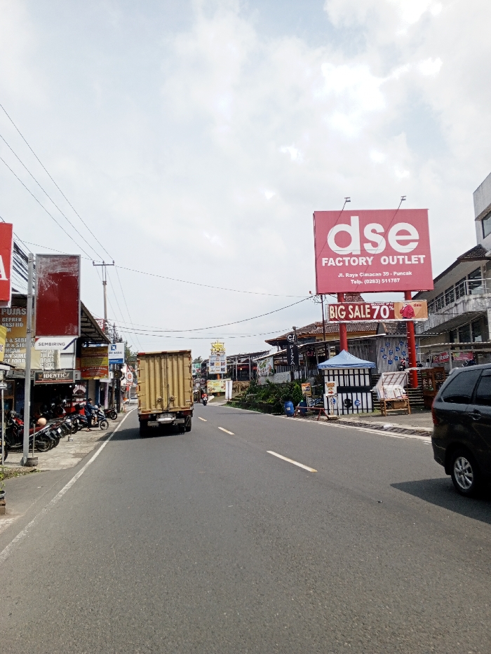 The image depicts an active commercial street scene during daytime under an overcast sky. The scene is presented as being in Multhan, India; however, prominent signage identifies the location as Jl. Raya Cimacan 39 - Puncak, Indonesia. An asphalt road occupies the foreground and middle ground, featuring a broken white center line and solid white lines marking the shoulders. A light-colored box truck, with its rear visible, moves away from the viewer in the left lane. The rear portion of a dark-colored SUV is visible in the right foreground, either parked or moving slowly on the right shoulder. Further down the road, a motorcycle is visible in the right lane. On the left side of the road, a narrow sidewalk is lined with approximately 8-10 motorcycles parked diagonally in front of low-rise commercial buildings. Visible storefront signs include "PUJAS," "GEPREK," "JUICE," "SEMBIRING," "IDENTIC," and "BANK MANDIRI ATM." Several utility poles with a dense network of overhead wires run along this side of the street. At least two individuals are discernible on the left sidewalk near the motorcycles and storefronts. The right side of the road features a prominent red billboard displaying "dse FACTORY OUTLET" and the address "Jl. Raya Cimacan 39 - Puncak." Below this, a smaller red sign advertises "BIG SALE 70%." Adjacent to the road, a light blue canopy shelters a striped vendor stall. At least one person is seated under this canopy. Further down, commercial buildings with stepped entrances are visible, along with another partially obscured sign reading "CJ." One additional individual is visible further down the street on the right.