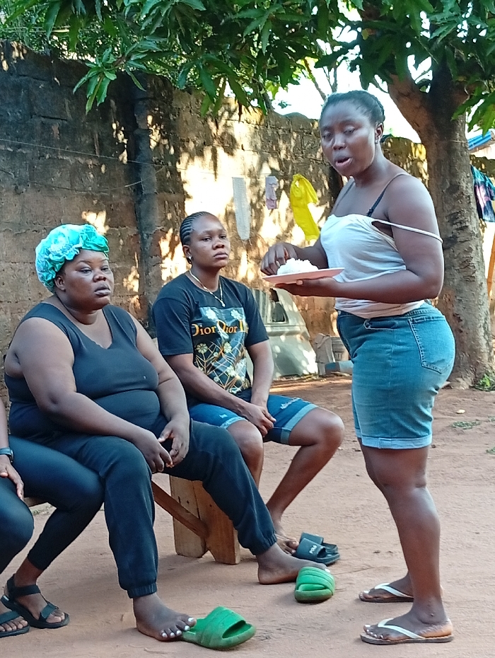 The image depicts an outdoor scene in Ogidi, Nigeria, featuring three adult females and a partial fourth individual