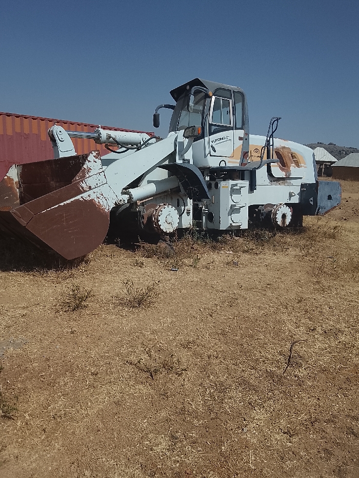 The scene, located in Bassa, Nigeria, displays an outdoor area under a clear, cloudless blue sky. A large, white and light blue YUTONG wheel loader, exhibiting considerable rust, faded paint, and peeling areas, occupies the center. Its prominent front bucket is significantly rust-colored (reddish-brown). The ground consists of dry, sparse, golden-brown grass and soil, with a few small green shrubs scattered throughout. To the left background, a reddish-orange shipping container is partially visible. In the right background, several small structures with light-colored roofs, possibly rural dwellings, are present, with distant hills visible beneath the horizon. No individuals or immediate activity are observed.