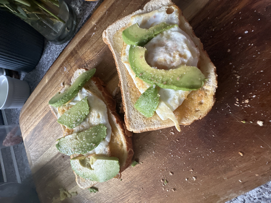 - "The scene presents two portions of avocado toast with fried eggs on a rectangular wooden cutting board" by FM-kBeqb2, licensed under CC BY 4.0