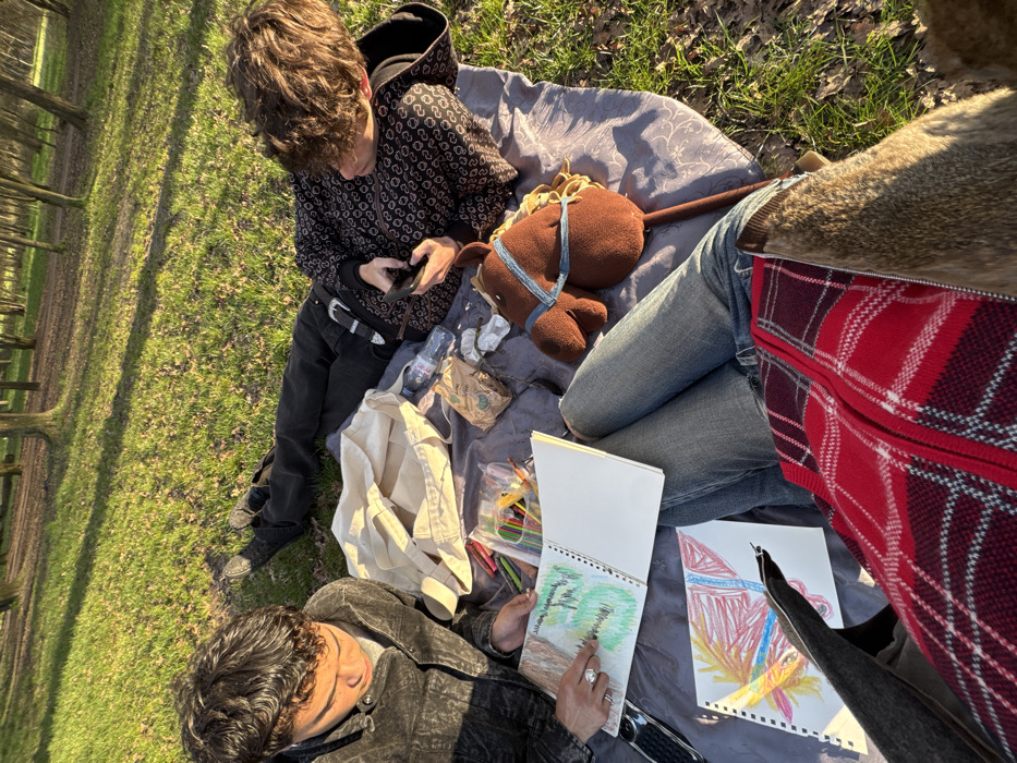 The image depicts an outdoor leisure scene in the city of Saint-Mandé, France, featuring three individuals on a sunny day. Two individuals are positioned on a patterned grey blanket laid over a grassy area interspersed with dry leaves and illuminated by strong, low-angle sunlight, casting visible shadows. On the left, a person with dark, curly hair, wearing a dark jacket, is seated and actively coloring in a spiral-bound sketchbook with a green crayon, depicting a landscape of green hills. A silver ring is visible on their right hand. On the right, a person with lighter, curly hair, dressed in a dark hooded jacket with a repeating pattern, is lying partially reclined, operating a smartphone with both hands. Their legs are extended, clad in dark pants and dark boots featuring a silver buckle on one. Between these two, on the blanket, are several items: a light beige canvas tote bag, a partially full plastic Evian water bottle, two small brown paper bags (one crumpled), and several white crumpled tissues or wrappers. A transparent container filled with assorted colored crayons or pencils is also present. A second spiral-bound sketchbook, located below the one being actively colored, displays a vibrant drawing of an abstract animal head in red, yellow, and blue hues. A brown stuffed hobby horse with a blue bridle rests on the blanket near the person on the right. In the immediate foreground, the legs of a third individual are partially visible, wearing blue jeans and a red plaid zipped jacket, suggesting a seated position or the perspective of the photographer. The background consists of a sparse woodland area with slender tree trunks and green grass, indicating a park or wooded recreational space.