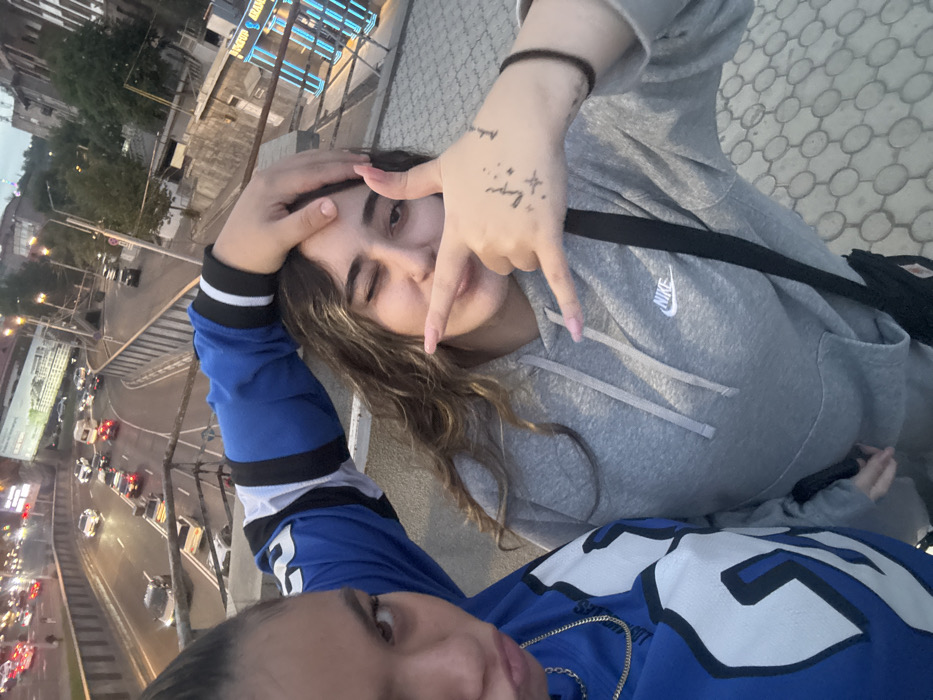 Two individuals are captured in a close-up, elevated perspective during what appears to be dusk or early evening. The image shows them posing on a paved surface, likely an overpass or pedestrian bridge, overlooking a busy, multi-lane urban roadway. The individual on the left is partially visible, primarily their upper body, turned slightly toward the camera. They wear a blue and white long-sleeved jersey with a visible "G" or similar letter graphic. A gold chain is visible around their neck. Their dark hair is pulled back, and they have a slight pout on their face, looking directly at the camera. Their right arm extends over the head/shoulder of the second individual. The individual on the right is more fully visible, wearing a grey hooded sweatshirt with a white Nike logo on the chest. They have long, wavy brown hair. Their face is turned towards the camera, with their right eye winking and their lips slightly open. Their left hand is raised, performing a "shaka" or "hang loose" gesture (thumb and pinky extended, middle fingers folded). Small black tattoos, including what appears to be "love" and several stars, are visible on the back of their left hand. They have light pink nail polish and wear a thin black bracelet on their left wrist. A black strap, likely from a cross-body bag, is visible over their right shoulder. In the background, a multi-level highway system is active with numerous vehicles, some displaying illuminated headlights and taillights. Concrete barriers and metal guardrails line the roadway. Streetlights are illuminated. On the far right, a building with vertical blue neon lights and partial Armenian text, including "ՍՈՒՐՄԱԼՈՒ" (Surmalu), is visible, suggesting a commercial establishment. Other urban buildings and trees are present in the distance under a dusky sky. The scene is located in Yerevan, Armenia, specifically overlooking Arshakunyats Avenue in the vicinity of the Surmalu Market, identified by the distinctive multi-level road infrastructure and the visible "ՍՈՒՐՄԱԼՈՒ" signage.