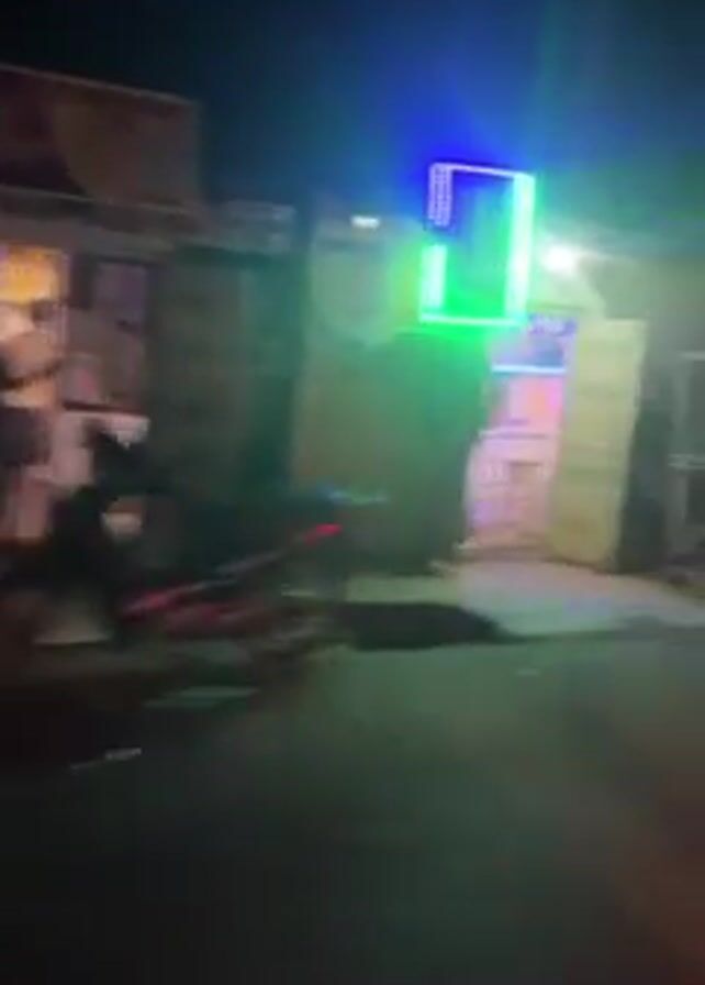night scene on a street. Several small buildings are visible, with people standing in front of and inside them. Some of the buildings have lights. The overall lighting is dim, but there are some artificial lights that create some visibility. The street appears to be empty except for the people near the buildings. The camera seems to be moving slowly along the street, capturing the scene as it passes.
