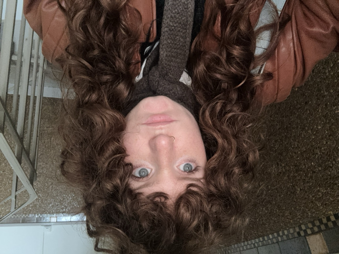 The scene depicts one individual, appearing female, positioned within an indoor stairwell or hallway in the city of Suresnes, France. The subject, captured in a close-up, chest-up shot, has reddish-brown curly hair with bangs, blue eyes, and a silver ring piercing in the right nostril. She is wearing a brown leather-like jacket, a dark brown knitted scarf, and a light blue garment partially visible beneath the jacket. A white collar or lining is also discernible. Her facial expression is neutral, with a slight pout, as she looks directly into the camera. The immediate environment includes mosaic-tiled surfaces. To the subject's left, a wall or floor features dark, granulated tiles bordered by a black and white checkerboard pattern. To the right, a similarly textured mosaic wall is visible, alongside a light-colored metal handrail indicating an ascending staircase. A small, white rectangular fixture is mounted on the upper right portion of the wall.