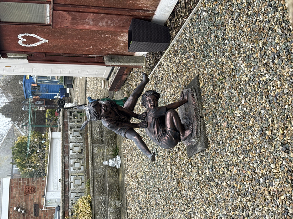 This image captures a bronze-toned garden sculpture of two children playing leapfrog, positioned on a gravel-covered surface in an outdoor residential setting in Caister-on-Sea, United Kingdom