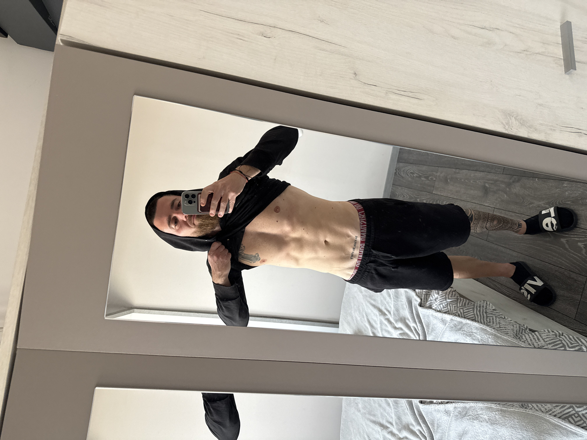A man is posing in front of a full-length mirror in a room. He is wearing a black hoodie and black shorts, pulling up the hoodie to expose his abdomen. He is also wearing black sandals with white lettering. He is holding a smartphone, presumably taking a selfie in the mirror. A bed is visible behind him with a gray patterned duvet. The floor appears to be dark gray wood-like material. A wooden cabinet with a handle is partially visible on the left and above the mirror. The scene is likely indoors. There is no information in the image to identify the exact location in Sofia, Bulgaria.