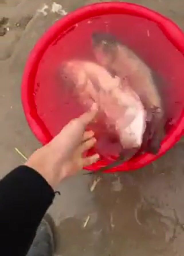 A person wearing black pants and black boots is standing outside, holding a red plastic bucket with water and two fish in it