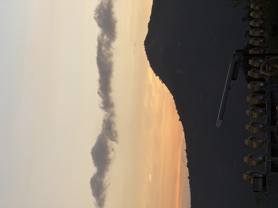 This image presents a twilight landscape in Vĩnh Lương, Vietnam. The upper portion of the frame displays a sky transitioning from a pale blue at the zenith to a warm orange and yellow gradient towards the horizon. A prominent, elongated dark grey cloud bank stretches horizontally across the mid-upper section of the sky. Below the horizon, two dark, silhouetted mountain ranges dominate the middle ground. The larger mountain on the right features a visible winding path leading towards its summit. In the foreground, a man-made structure is visible, consisting of a concrete wall or railing. Mounted atop this structure is a series of uniformly spaced, golden, crescent-shaped or circular objects, possibly decorative fixtures or part of a religious structure. A dark, rectangular, modern lighting fixture or solar panel assembly on a pole extends diagonally upwards from the lower-right quadrant, partially obscuring the mountain backdrop. A smaller dark floodlight is also visible on the concrete structure's left side. No individuals, actions, or direct interactions are discernible within the scene. The environment indicates an outdoor setting during late daylight hours, characterized by natural topography and artificial structures.