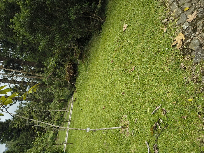 A lush, green lawn occupies much of the frame, scattered with twigs and fallen leaves. Adjacent to the lawn, a stone-paved pathway is visible. The lawn slopes gently towards a dense array of trees and foliage. The branches obscure the horizon, hinting at a wooded area beyond. The image is shot with a slightly disorienting perspective.