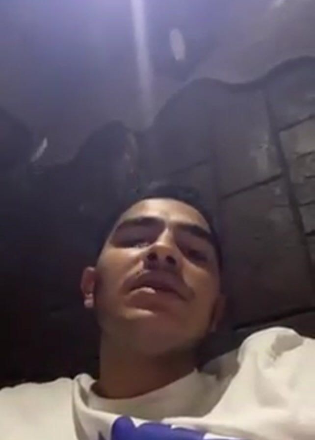 young man with short dark hair, wearing a white long-sleeved shirt with a blue design. He is indoors, the surroundings dimly lit. A light source shines from above, creating glare. The man looks at the camera, then exhales a large cloud of smoke upwards, attempting to make smoke rings. The background shows a textured wall and what appears to be a metal structure. The camera angle is low, looking up at the man.