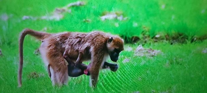 - "An adult baboon, characterized by its brownish-tan fur, dark facial skin, and a long, curved tail, stands in a field of vibrant green grass" by FM-KpKSC3, licensed under CC BY 4.0