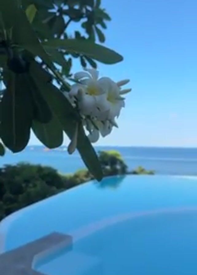 The camera pans from a bunch of white flowers on a leafy branch to an outdoor infinity pool. The pool is turquoise blue with a white border. Beyond the pool is the ocean under a clear blue sky. Along the coastline there are various sizes and shapes of trees. The reflection of the sky and trees on the surface of the pool water is very clear.