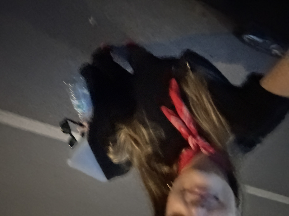 The image displays a low-light, blurred scene at night, depicting a person in Porto, Portugal. The individual has long, light brown hair and is wearing a dark jacket. A red, knotted scarf is visible around their neck. Sunglasses are perched on a light-colored head covering, possibly a cap, positioned above their forehead. A dark backpack is on their back, containing indistinct lighter-colored objects. The ground surface is dark asphalt, featuring a single white painted line on the left side. A hand or arm is partially visible in the lower right corner, suggesting a close-range capture from a slightly elevated perspective. No distinct facial features are discernible.