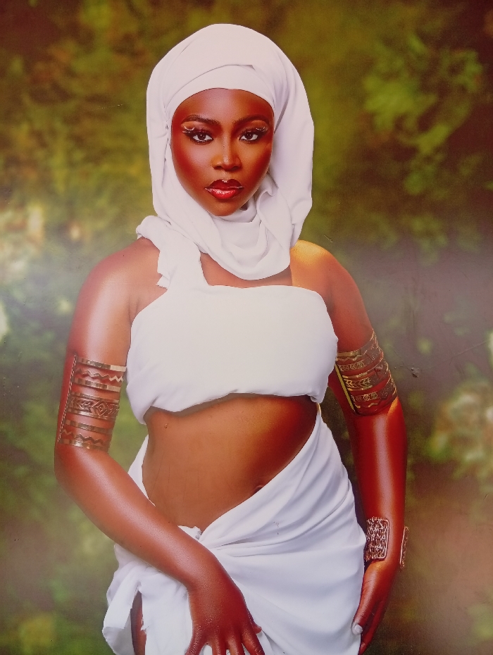 A studio portrait features a single, adult female of African descent, standing upright and looking directly at the viewer. She is adorned in white fabric, consisting of a headwrap covering her hair and neck, a bandeau-style top exposing her midriff, and a draped lower garment revealing her right upper thigh and parts of her left leg. Her skin appears luminous. Both forearms display rectangular, gold-colored cuffs with intricate patterns, while both upper arms feature multiple stacked gold-colored armbands with geometric designs. Her face is made up with prominent white eyeliner extending from the outer eye corners, dark eyebrows, and red lipstick. The background is a soft-focus blur of green and brown hues, suggesting an outdoor natural environment. This scene is located in the city of Jos, Nigeria.