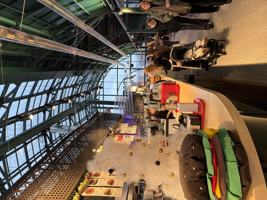 The image depicts an interior scene within the Depo.Moscow Food Mall, a former tram depot converted into a food hall located in Moscow, Russia. The shot is taken from a low angle, looking across a light wooden service counter towards the back of the establishment. In the immediate foreground on the counter is a large, plush, stylized burger cushion. To its left stands a white, artificial Christmas tree adorned with gold and black spherical ornaments. Behind the counter, a female employee with dark hair, wearing a dark uniform, is visible, working at a station equipped with various dispensers, a red tray, and a glass display case. Menu boards displaying burger options and prices (e.g., "720₽", "520₽") are mounted on the wall behind the counter. To the right of the counter, a woman with long blonde hair stands, seemingly interacting with the counter staff. Beside her, a baby is reclined in a black stroller. Further into the mid-ground and background, several individuals are walking or standing, populating the food hall. One woman in a dark coat and another wearing a light green scarf and dark coat are visible moving right to left. The environment features a high, arched glass roof supported by a dark green metal framework, allowing natural light to illuminate the space. Exposed metallic ventilation ducts and track lighting fixtures are suspended from the ceiling. A perforated metal railing runs along an upper level to the left. A partial sign displaying the Cyrillic word "ДАЧА" (Dacha) is visible in the background, near the ceiling. The floor is composed of light-colored wooden planks. Through the large windows at the far end, a grey sky and distant city structures are discernible. The overall atmosphere suggests a casual, bustling public dining space, possibly during the winter holiday season.