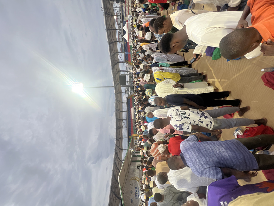 A wide-angle, slightly elevated perspective captures a large-scale outdoor gathering of thousands of predominantly male individuals on the field of a stadium in Zanzibar City, Tanzania, consistent with Amaan Stadium. The sky is overcast, with a bright floodlight on a tall pole casting a significant flare from the right side of the image. The stadium's multi-colored seating (red, blue, green) is visible in the background, mostly empty. The ground where the crowd stands is covered with a light-colored mat or tarp. Many attendees wear kufis (prayer caps) in various patterns and colors, along with a mix of traditional white robes and casual clothing. White event tents are erected on the left side, one featuring text including "JBC" and "IFTAR KITA." Individuals in the foreground are standing, some looking at mobile phones. Red and green bags or prayer mats are distributed on the ground. The scene depicts a densely packed assembly, indicating a significant community or national event, likely an Iftar gathering.