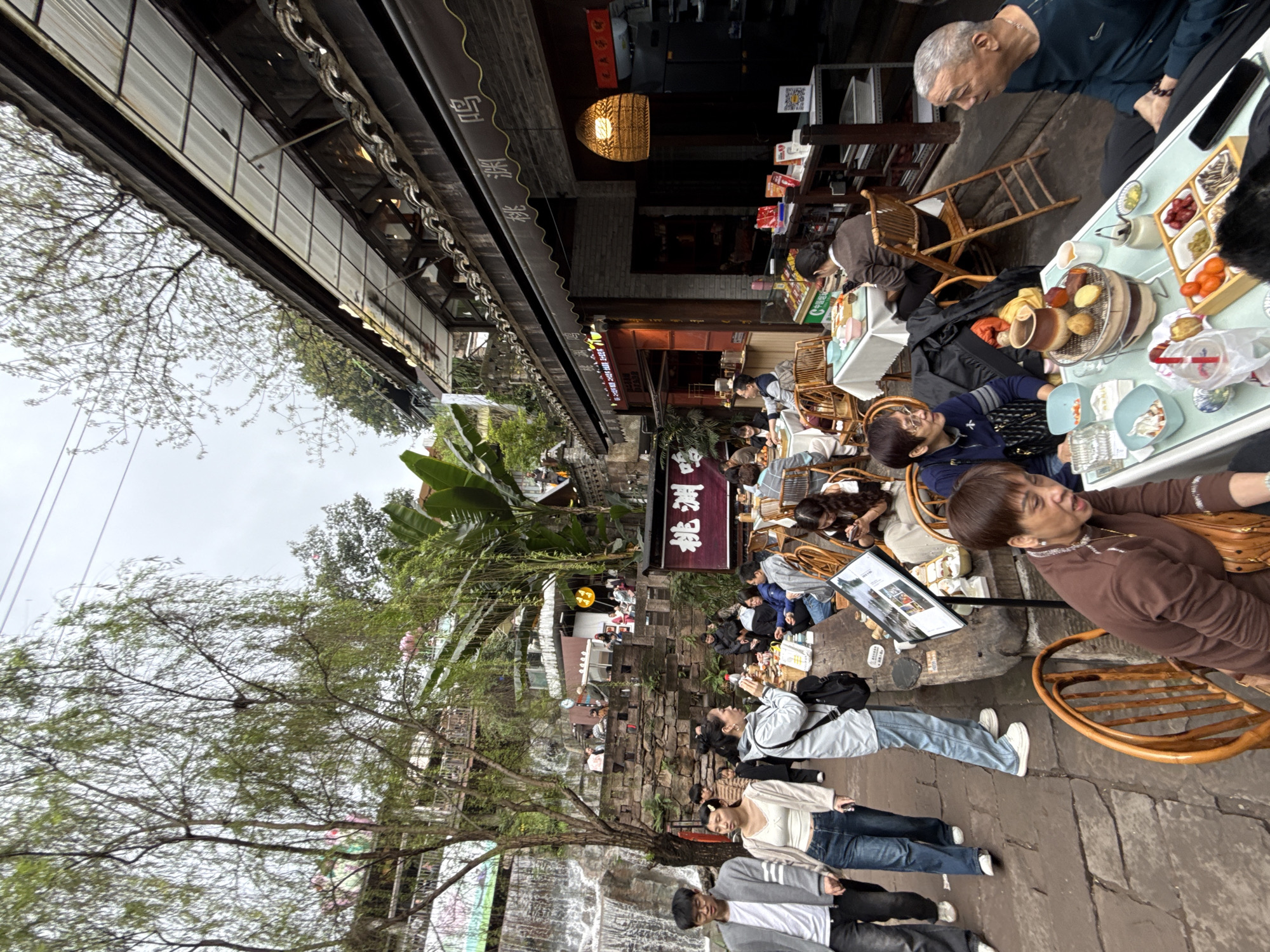 This image depicts a bustling outdoor dining and pedestrian area located at Danzishi Old Street in Nan'an District, Chongqing, China. The scene is characterized by multi-tiered traditional Chinese architecture, featuring dark tiled roofs, wooden structures, and stone-paved pathways under an overcast sky. Numerous individuals of Asian descent are present, engaged in various activities. In the foreground, an older man with white hair, wearing a dark shirt, is seated at a white-clothed table, conversing with someone off-frame to his left. The table holds multiple dishes, including a central charcoal grill with cooked items like potatoes and vegetables, along with various condiments and bowls. A woman with short, dark hair and glasses is seated opposite him, looking to her left. Partially visible to the immediate left of this group is a woman with short, brown hair, wearing a brown long-sleeved top, leaning forward at another table. In the mid-ground, to the left, a young couple walks towards the viewer; the man wears a grey jacket and glasses, and the woman wears a white top and blue jeans. To their right, a woman in a light grey jacket and blue jeans, carrying a black backpack, is holding a smartphone upwards, possibly taking a photograph. Several other groups are seated at similar outdoor dining tables with wooden chairs, visible throughout the mid-ground and background, eating and conversing. The environment is rich with vegetation, including willow-like trees with weeping branches on the left, and large-leaved tropical plants like banana trees scattered around. A prominent artificial waterfall cascades down a multi-tiered stone wall on the far left side of the image. Along the right, traditional shopfronts are visible, with dark wood awnings and tiled roofs. A large sign with Chinese characters "桃渊鸭" (Tao Yuan Ya) is prominently displayed on a restaurant facade, which also features a large, woven, illuminated lantern. A menu display stand is positioned near the pedestrian path in the mid-ground. The ground is paved with irregularly shaped stone tiles.