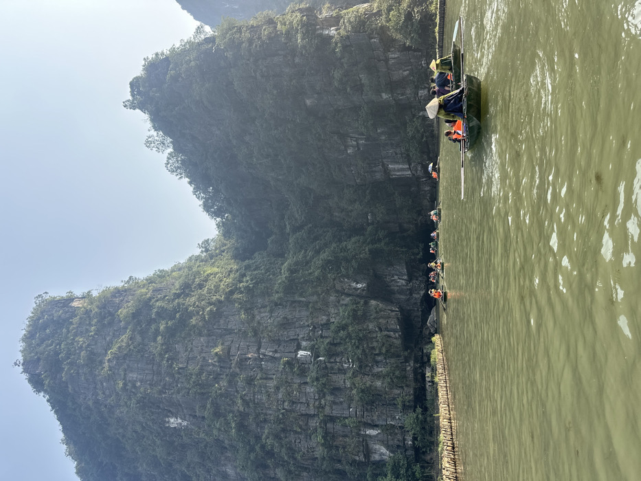 river with a series of rowboats traveling along the water. Each boat contains passengers wearing life jackets. Adjacent to the river are large, rocky cliffs covered with vegetation. The sky is light blue and hazy. The angle of the photo appears to be rotated sideways.