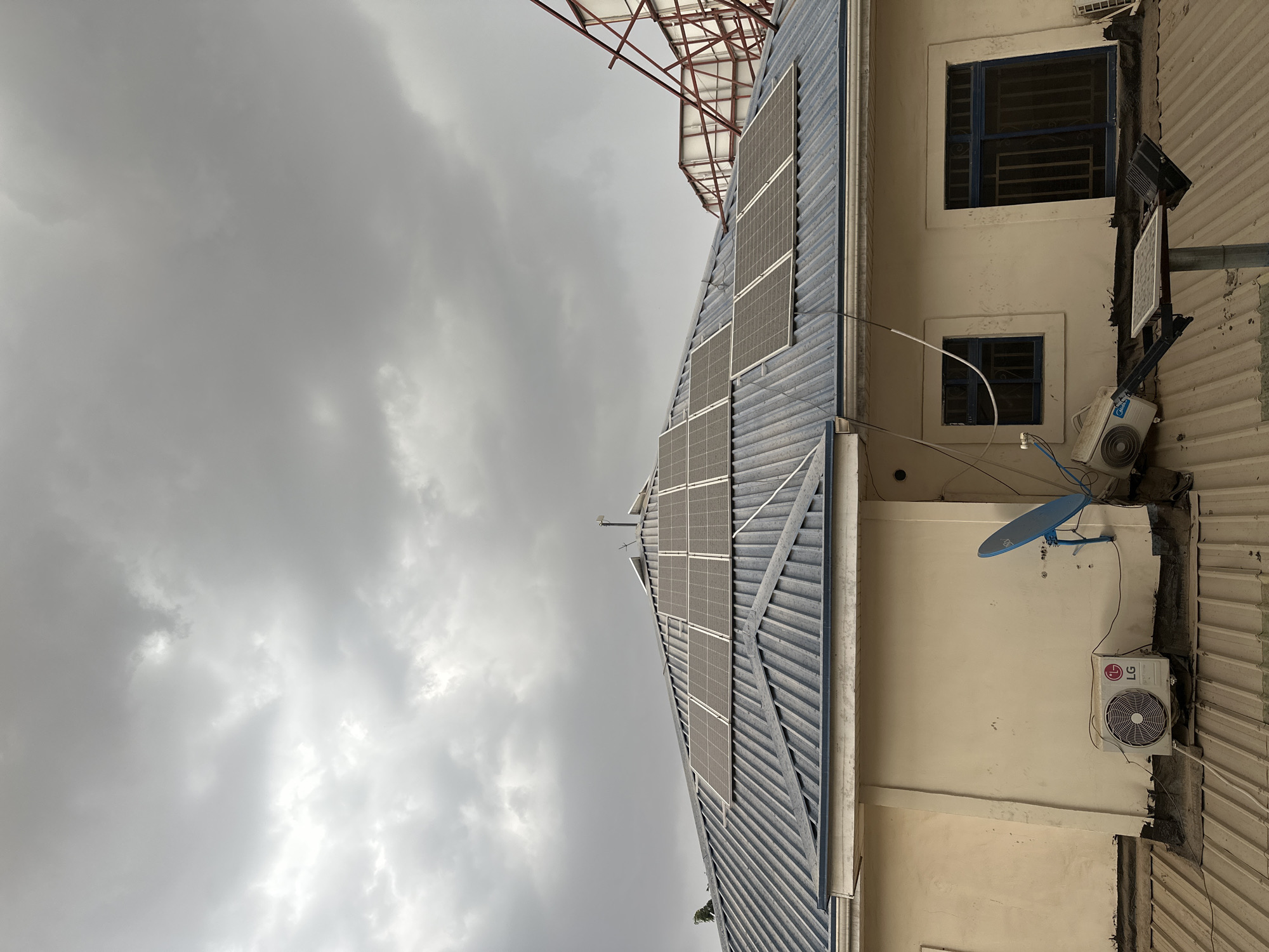 The scene depicts the exterior of a building in Gwarinpa, Nigeria, under a heavily overcast sky. The structure features a blue corrugated metal roof, densely covered with multiple arrays of dark solar panels. Below the main roof, a cream-colored exterior wall is visible, mounting two air conditioning condenser units, one prominently displaying an "LG" logo, and a small, blue satellite dish. Two rectangular windows with blue frames and dark security grilles are also present on this wall. Below these windows, positioned on a lower roof section, is a solar-powered floodlight mounted on a pole. In the upper right background, a partial red metal framework with white infill panels is visible, suggesting an adjacent structure. No individuals are present in the image.