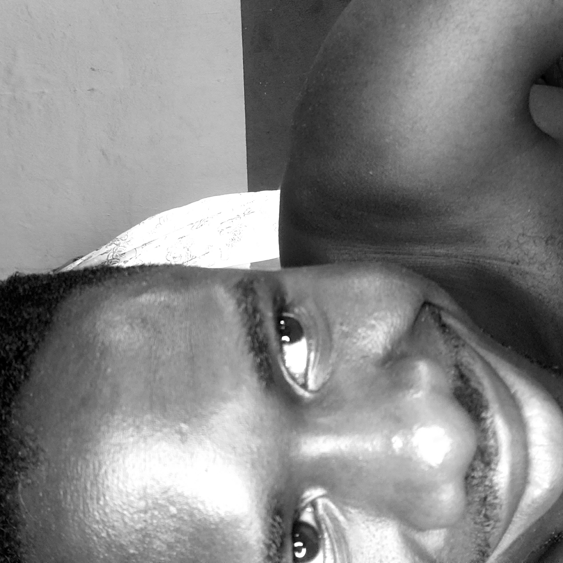 A close-up, black and white image shows a man's face in Narayi, Nigeria. He is lying down with his head on a patterned pillow. The camera is positioned close to his face, capturing detailed features of his eyes, nose, and mouth. His arm is raised beside his head. The background includes a wall and what appears to be a shadowed area.